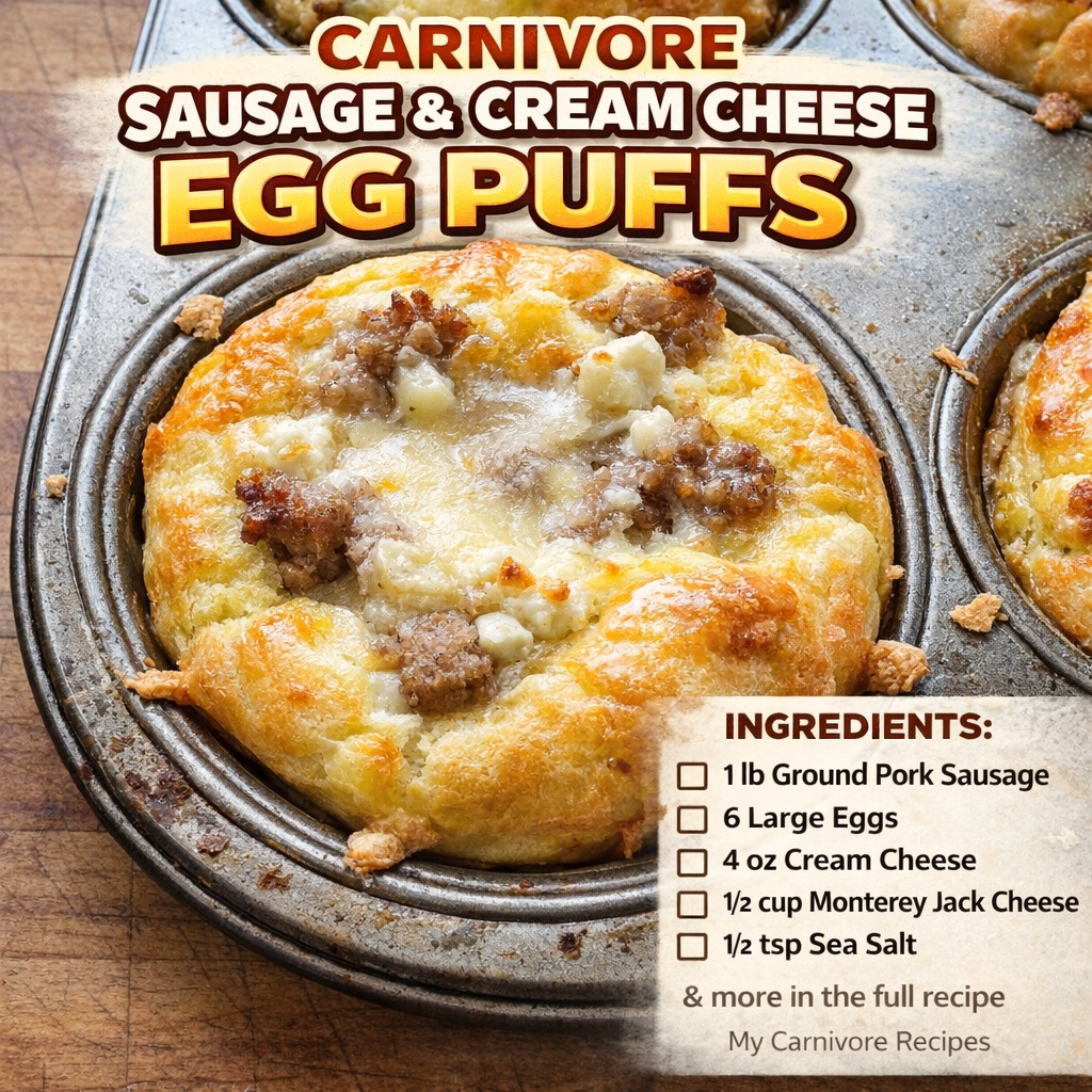 This recipe for carnivore sausage and cream cheese egg puffs is a wonderful journey into the world of animal based cooking that turns simple high quality proteins into a soft and golden masterpiece for your breakfast table. You are going to learn how to take savory ground sausage and rich cream cheese and fresh eggs to create a portable meal that is both incredibly fluffy and deeply satisfying without using any flour or sugar at all. Most people think that a muffin or a puff must have grains or bread to hold its shape but this guide will show you that the natural power of egg proteins and dairy creates a texture that is even more luxurious and tender. This article is written in very easy English words so that any beginner can follow along and feel totally confident while they are working in their kitchen to create a healthy meal for themselves or their family. You will see how the juices from the roasting sausage react with the melting cheese to create a savory center that provides a burst of flavor in every single bite you take today. Making your own meat based snacks at home is a very rewarding experience because it allows you to avoid all the hidden starches and chemical preservatives found in many store bought breakfast sandwiches or frozen egg bites. By the end of this guide you will have a deep understanding of how to whisk and bake your ingredients to create a dish that provides pure joy and steady energy without a midday crash. Once you taste the incredible depth of flavor that comes from real pork and high quality cream cheese you will likely find it hard to go back to processed cereals that leave you feeling hungry. Your body will feel so much more energized and satisfied because you are using real whole food ingredients that support your daily vitality and your long term health goals for years to come.